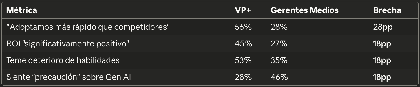 Los vicepresidentes van a conferencias sobre IA, leen reportes de Gartner, hablan con vendedores que les muestran demos perfectas. Su narrativa es optimista porque su trabajo es vender la visión.